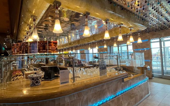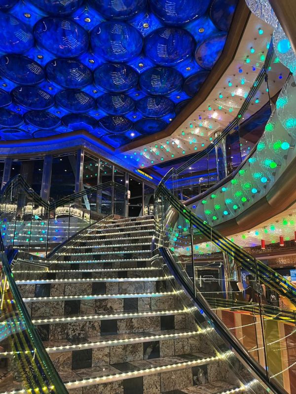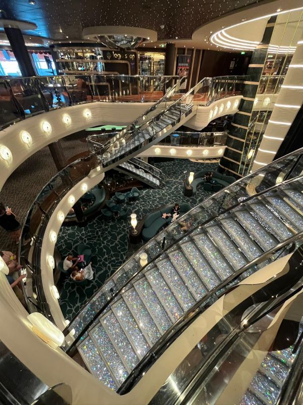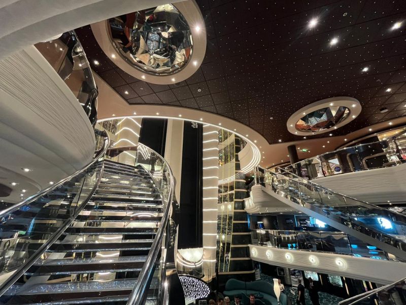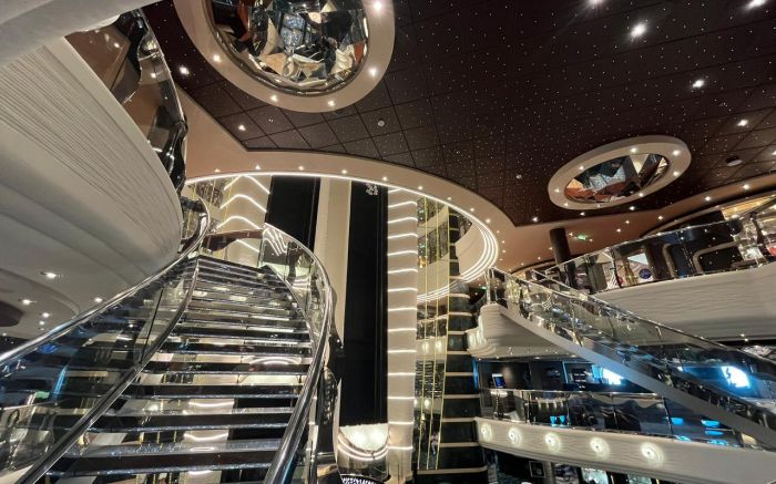 Se o Costa Diadema abraça, o MSC Preziosa impressiona. O navio aposta no “uau” visual e no luxo clássico — e cumpre a promessa logo no primeiro passo, com as icônicas escadarias de cristal Swarovski no lobby.