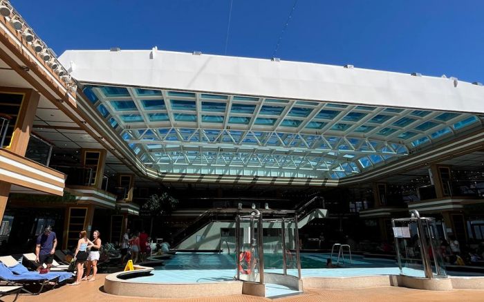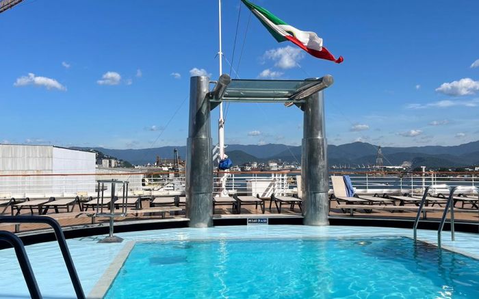 São cinco piscinas, uma com teto retrátil e outra de borda infinita, com vista direta para o mar. O astro é o Vertigo, um dos maiores toboáguas do mundo, com 120 metros e um trecho transparente que sai do navio.
