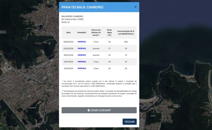 Entre os dados mais recentes, a análise feita no último dia 9 classificou o local como próprio, mesmo com registro de chuva fraca nas últimas 24 horas. A temperatura da água foi de 26°C e a concentração de e. coli chegou a 836 NMP por 100 mililitros, dentro dos limites considerados adequados pelo órgão ambiental.