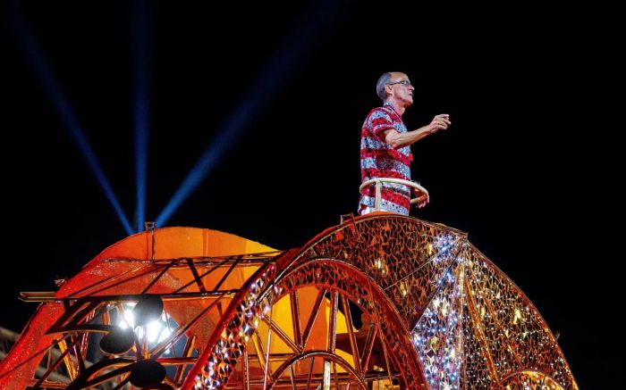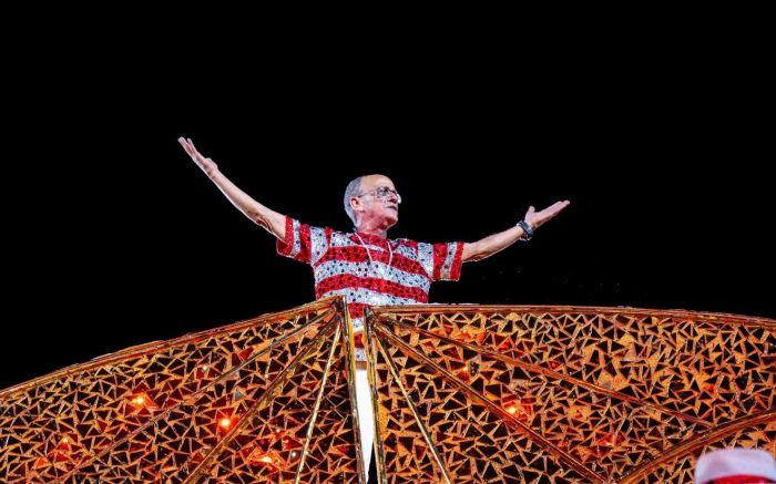 Outro momento de arrepiar foi a releitura da cena icônica do carnaval de 2007. Ele repetiu o feito de comandar a bateria em um carro alegórico. Junto com os ritmistas e da rainha Juliana Paes, ele regeu o espetáculo do alto.