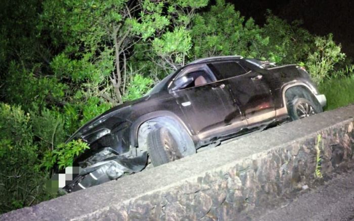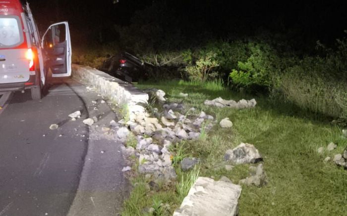 O acidente aconteceu perto das 3h na avenida Rodesindo Pavan, nas proximidades da entrada da praia do Pinho. A picape fazia uma curva quando passou reto, quebrou a mureta de proteção do acostamento e foi parar no mato.