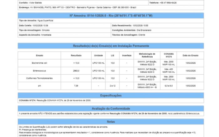 A coleta da água foi feita no dia 10 de fevereiro. A análise foi assinada pela técnica Mariana Lopes da Silva, da Aquaplant Química do Brasil, de Joinville. O laudo aponta que a amostra não atende aos padrões da legislação ambiental nem às normas do Conselho Nacional do Meio Ambiente (Conama).