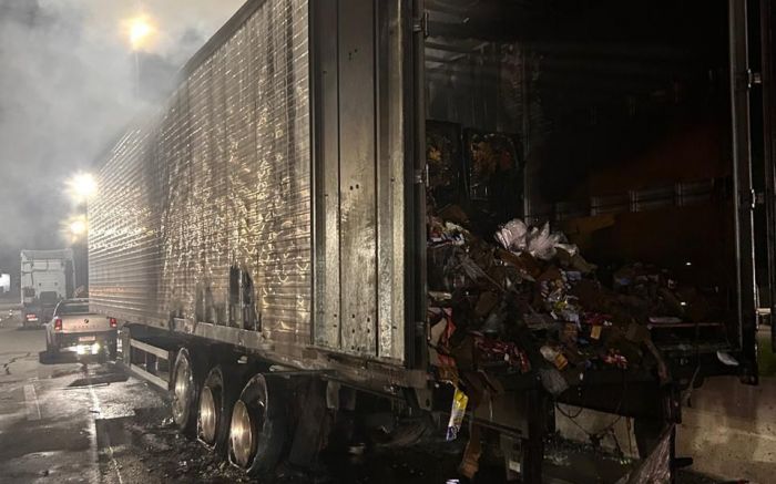 O Corpo de Bombeiros Militar foi chamado após a informação de incêndio no veículo. No local, os socorristas encontraram uma carreta baú desatrelada do cavalo mecânico, com fogo concentrado na parte traseira do compartimento de carga e nas rodas.
