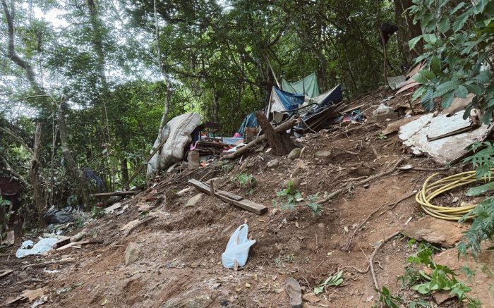 No local, foi encontrado um casal com um cachorro da raça pitbull. A estrutura já tinha vigas de sustentação e parte do assoalho pronta. Também havia grande quantidade de lixo, incluindo três colchões.