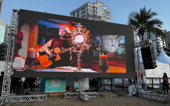 A transmissão começou às 4h e seguiu até o amanhecer. Frei Gilson reúne centenas de milhares de fiéis em suas novenas online, entre as mais acessadas do Brasil. Em Itapema, o público acompanhou a live em um telão instalado na orla, com transmissão pelo canal do religioso no YouTube.