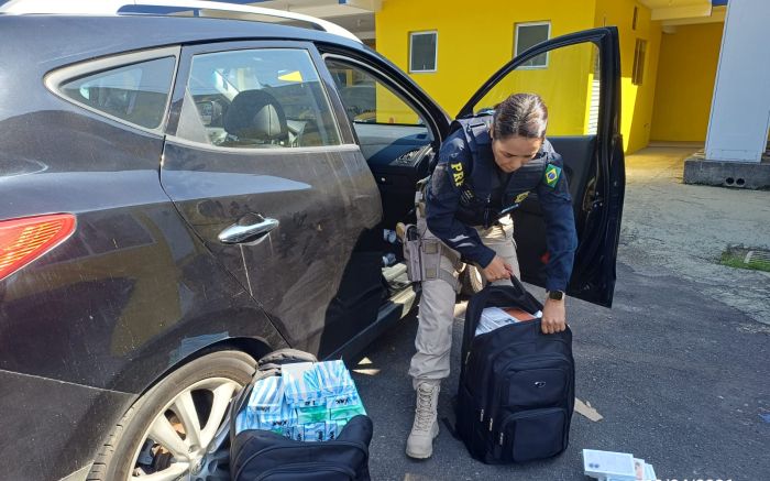 O carro foi abordado com centenas de aparelhos escondidos em mochilas. A mercadoria vinha do Paraguai e era transportada sem o pagamento de impostos, o que configura crime de descaminho.