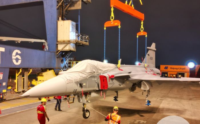 Mais um caça Gripen desembarcou na Portonave, em Navegantes. A aeronave é a nova integrante da Força ...